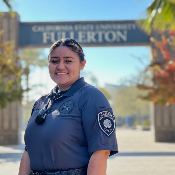 Professional • 2nd December 2025 Campus Safety Specialist CSUF Police Department - Campus Safety Specialist (CSS) posing in front of CSUF arch